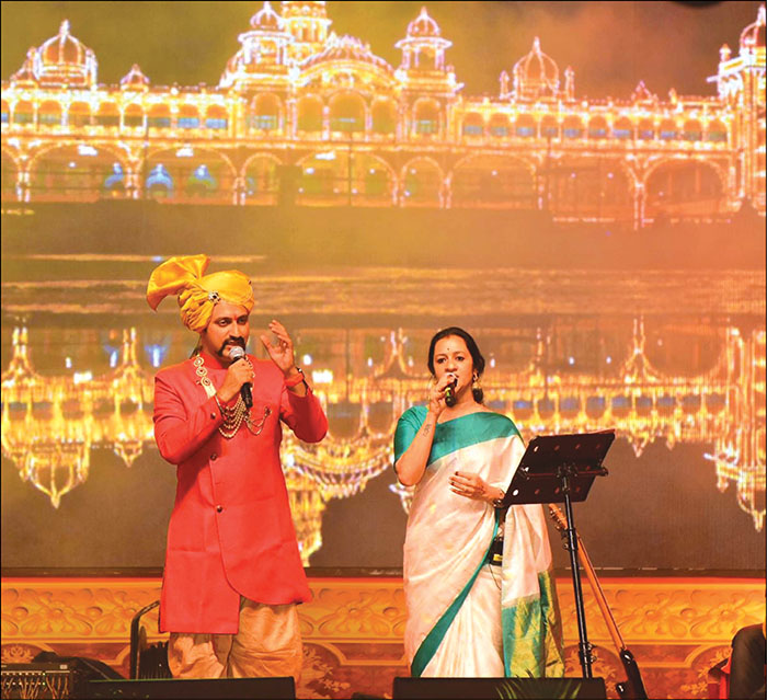G.P. Rajarathnam’s ‘Yenda Yedti Kannad Padagal Andre Ratnang Prana…!, Santa Shishunala Sharif’s ‘Taravavalla Tagi Ninna Tamburi Swara…’, Rashtrakavi Kuvempu’s ‘Ba Indu Sambhramisu Indenna Hrudayadali…’, K.S. Nisar Ahmed’s ‘Nityotsava…’, H.S. Venkatesh Murthy’s ‘Thoogu Manchadali Koothu Megha Shama Radhegatu…’ and K.S. Narasimha Swamy’s ‘Deepavu Ninnade Gaaliyu Ninnade…’ were among the songs rendered to the applause of the gathering, who soaked in the spirit of music. Earlier the singer duo recited ‘Kayo Sri Gowri…’ the erstwhile State Anthem of Princely Mysore State having its genesis in Wadiyars, paying a perfect tribute to Dasara.