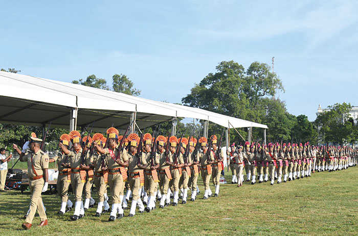 City Armed Reserve (CAR) Assistant Commissioner of Police (ACP) Kumaraswamy taking the salute during the rehearsal for Kannada Rajyotsava Parade at the Oval Grounds in city this morning. Picture right shows Reserve Police Inspector (Mounted Police) and Parade Commander S.S. Sasanur leading the parade. District Armed Reserve (DAR) Dy. SP Veeranna, Karnataka State Reserve Police (KSRP) Deputy Commandant Harish, CAR, DAR, KSRP, Mounted Police, Civil Police and Traffic Police personnel and NCC cadets took part in the rehearsal. Kannada Rajyotsava will be celebrated on Nov. 1.