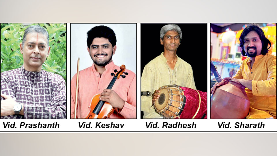Mysuru, Oct. 9- Ganabharathi, Mysuru, has organised a Karnatak classical vocal concert by Vid. N.R. Prashanth, a well-known artiste from Mysuru, at its Veene Seshanna Bhavan in Kuvempunagar tomorrow (Oct. 10) at 6 pm in memory of Savitha and the event is sponsored by H.R. Bhagavan and family. He will be accompanied by Vid. Keshav Mohankumar on violin, Vid. Mysore A. Radhesh on mridanga and Vid. Sharath Koushik on ghata.