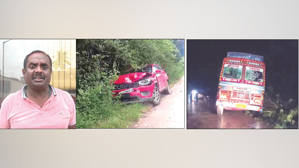 Madikeri, Oct. 24 – In a chilling incident straight out of a movie scene, a lorry rammed into a car in an apparent bid to murder a local businessman in Kodlipet, Somwarpet taluk, leaving the community deeply shaken.