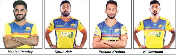 The players roped in during the auction are: Karun Nair (Rs. 6.80 lakh), Prasidh M. Krishna (Rs. 2 lakh), Manish Pandey (Rs. 12.20 lakh), S.U. Karthik (Rs. 50,000), C.A. Karthik (Rs. 4.20 lakh), K. Gowtham (Rs. 4.40 lakh), Yashovardhan Parantap (Rs. 2 lakh), M. Venkatesh (Rs. 2 lakh), L.R. Kumar (Rs. 1.50 lakh), Harshil Dharmani (Rs. 3.20 lakh), Goutam Mishra (Rs. 2.25 lakh), Shikhar Shetty (Rs. 4.70 lakh), K.S. Lankesh (Rs. 50,000), Sumit Kumar (Rs. 1 lakh), Dhanush Gowda (Rs. 50,000), S.M. Shamanth (Rs. 50,000), Kushaal M. Wadhwani (Rs. 50,000) and Sharath Srinivas (Rs. 1 lakh).