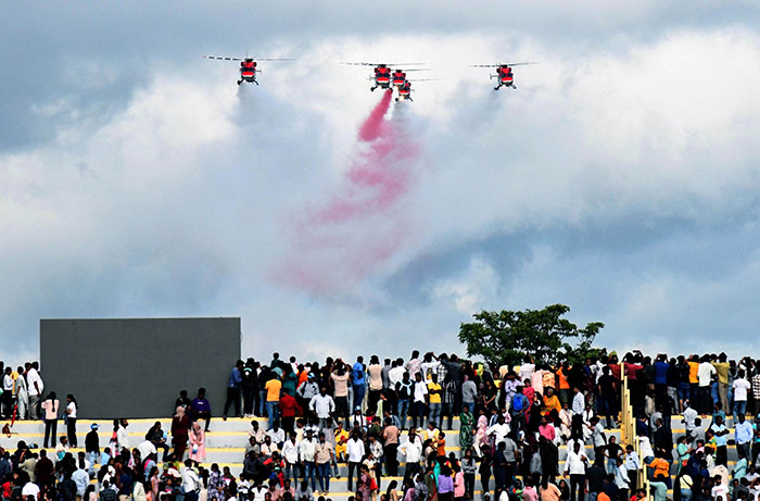 In another high-adrenaline sequence, a lone helicopter streaked through the centre with a blazing red smoke trail. In contrast, four others dispersed dramatically in different directions, adding a surge of excitement to the spectacle.