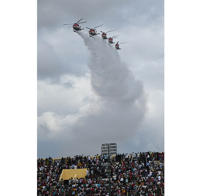One of the evening’s most memorable moments came when the helicopters painted the sky with trails of smoke to form the English letter “I,” followed by a stunning rangoli-style display of red and white smoke.