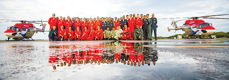 Sqn.Ldr. Aditya serves as Safety Officer, while Flight Lieutenant Pallavi takes on the role of commentator. Wg.Cdr. Adarsh Thakur, Colonel Chandan and Sqn.Ldr. Abhishek Thakur are part of the ground support team. The photo also featured engineers, ground crew, and technical staff alongside their ALH Dhruv helicopters.