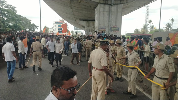 This morning, thousands of Hindu activists, BJP and JD(S) supporters gathered near Narasimhaswamy Temple and marched towards TB Circle via Pete Beedi. Police resorted to a lathi charge to disperse the crowd, resulting in injuries to several activists and women, who were admitted to Maddur General Hospital for treatment.