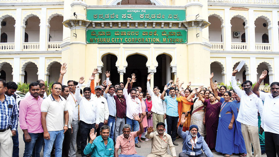 Mysore/Mysuru: Public services and sanitation work came to a grinding halt in Mysuru city this morning as staff and Pourakarmikas of the Mysuru City Corporation (MCC) went on mass leave and joined a Statewide strike demanding fulfilment of long-pending demands.