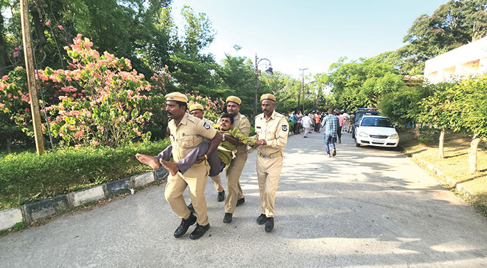 In the third drill, a mock bomb explosion was staged. Following the alert siren, a bomb disposal squad, supported by a canine unit, arrived on-site to inspect the area. Simultaneously, the Fire Department, Police and NCC Cadets coordinated rescue and evacuation efforts. First aid was administered to the injured by emergency medical teams.