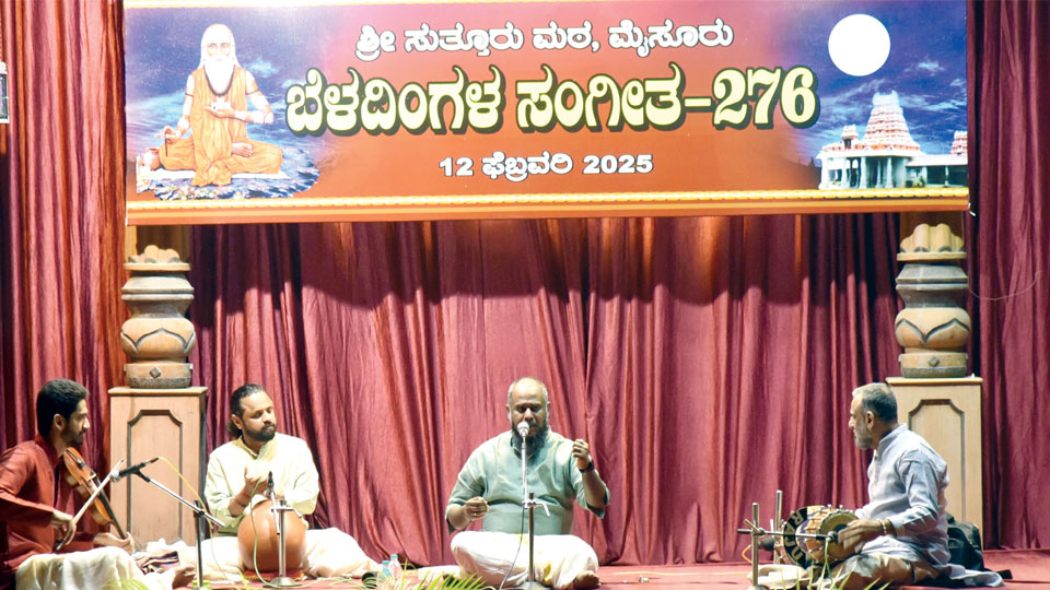 Vid. Harish Sivaramakrishnan presenting a vocal concert at Suttur Mutt premises, foot of Chamundi Hill, on Feb. 12 as part of Moonlight Music-276. He is accompanied by Vid. Mysore N. Karthik on violin, Vid. Giridhar Udupa on ghata and Vid. K.U. Jaychandra Rao on mridanga.