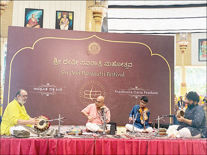 Picture shows Vid. Sriram Parasuram presenting a Karnatak Violin Concert at Ganapathy Ashram on Sept. 27. He is accompanied by Bhuvan Datta on violin, Vid. Anoor Ananthakrishna Sharma on mridanga and Vid. Sunaad Anoor on kanjira.