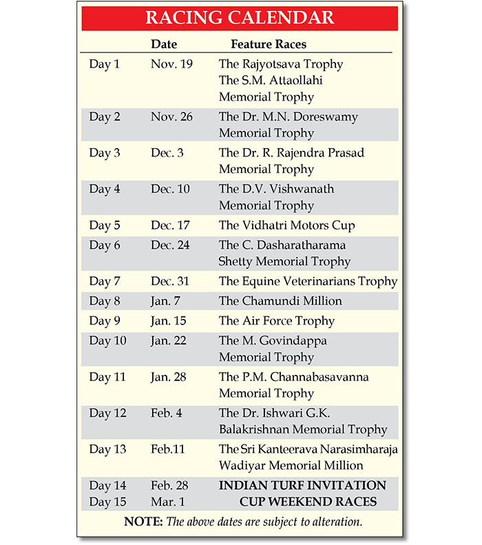 The total stakemoney advertised for the season is Rs. 4,55,00,000 including Cups/Trophies for the Season. Two prestigious Million Races — The Chamundi Million and The Sri Kanteerava Narasimharaja Wadiyar Memorial Million — will be conducted drawing top-tier equine talent from across the nation.