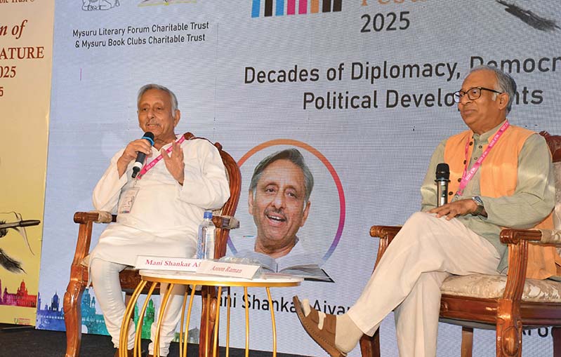 Aiyar was speaking this morning during a panel discussion titled ‘Decades of Diplomacy, Democracy and Political Developments’ on Day-2 of the ninth edition of the Mysuru Literature Festival-2025, organised by the Mysuru Literary Forum Charitable Trust and Mysuru Book Clubs Charitable Trust at Hotel Southern Star in city. He was in conversation with author Aroon Raman.