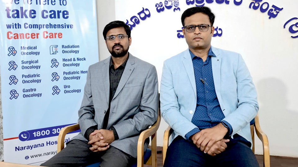 Dr. K.R. Suhas, Consultant - Surgical Oncology and Dr. H.M. Lokesha, Consultant - Surgical Gastroenterology Oncology, during a press meet in city recently.