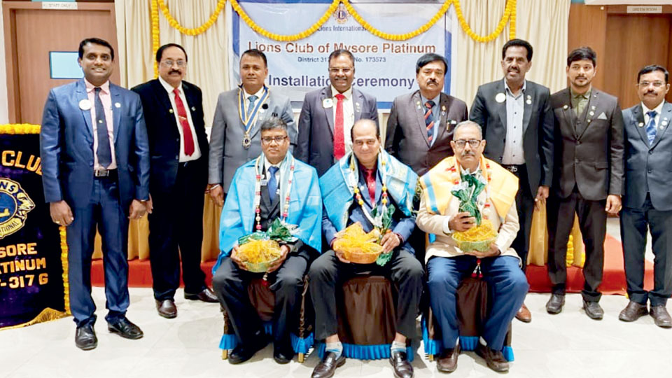 Lions Club of Mysore Platinum held its installation programme at a private hotel in city recently. Immediate Past Multiple Council Chairperson Ln. Dr. N. Krishnegowda pmjf inaugurated the event. Past District Governor Ln. Renu Kumar from Bengaluru installed the new office-bearers for the Lionistic year 2025-26. Lion Umashankar as the new President will lead the Club which has nearly 50 members from all walks of life. Seen in the picture are (standing from left) Ln. Naveen, Ln. Mahadev, Ln. Umashankar, Ln. Dr. N. Krishnegowda, Ln. Renu Kumar, Ln. Siddegowda, Ln. Mohan Kumar and Ln. Cheluvaraj with outgoing team (sitting from left) Ln. Suresh, Past Secretary, Ln. Kiran Bolar, Past President and Ln. Ganesh Prasad, Past Treasurer, who were felicitated.