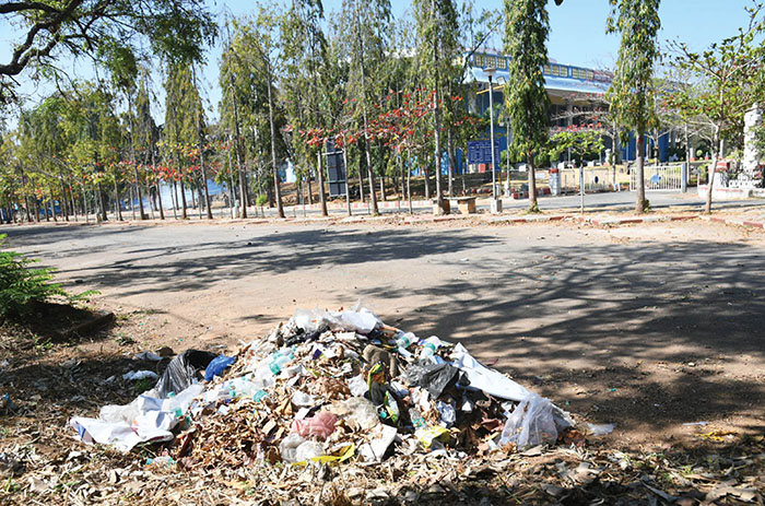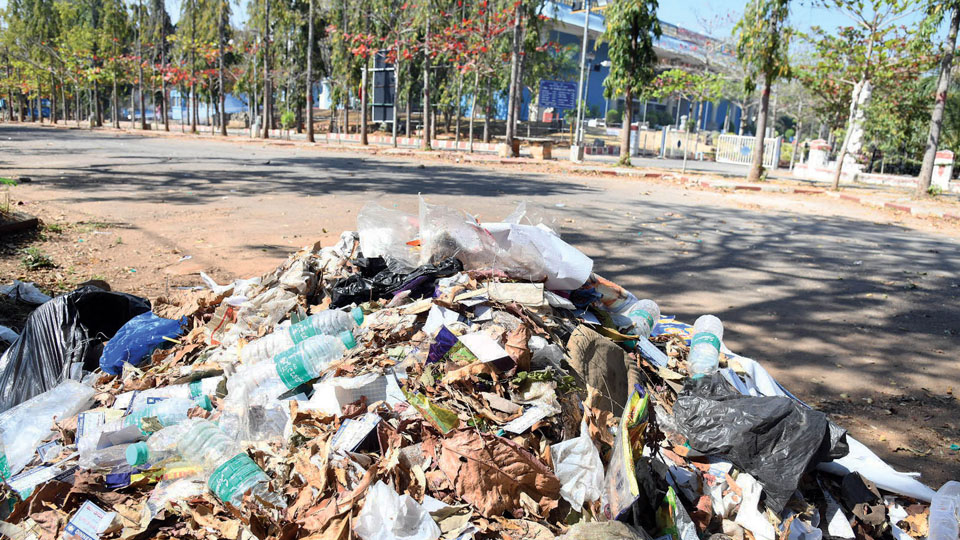 Even by Monday afternoon, the food stalls set up for the gathering remained uncleared, with used plates scattered around, emitting a foul smell. The mess remained even this morning, with waste bundled and dumped in corners, awaiting clearance by Mysuru City Corporation (MCC) workers.