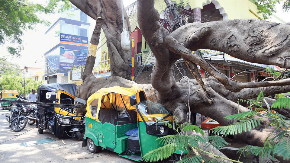 Mysuru: One person was injured and two auto rickshaws and a motorcycle were damaged when a huge trunk of tree fell on them on 14th Main Road in Saraswathipuram here this morning. The injured person, identified as Mahadeva, a vegetable vendor, was shifted a private hospital for treatment.