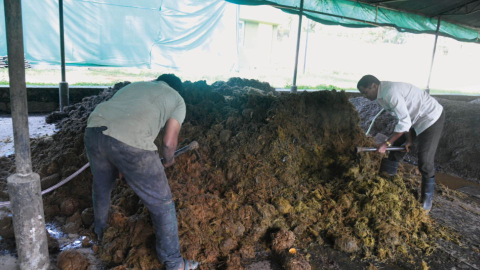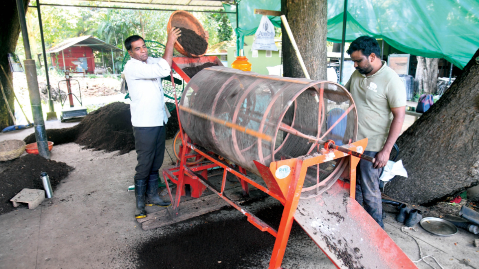 Earthworms are sourced from Shivamogga and bred on-site. Their reproduction enhances compost fertility, but protecting them from predators, such as rats and centipedes, remains a challenge. To safeguard the worms, staff have installed nets and bone powder barriers around the unit.