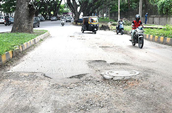 Mysore/Mysuru: Two major roads in Mysuru have become dangerously pothole-ridden, drawing the ire of motorists who are forced to navigate them in fear for their safety.