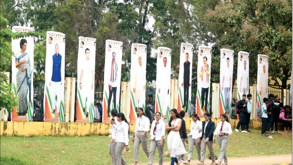 The Karnataka State Pollution Control Board (KSPCB) Golden Jubilee celebrations — an official Government event — ironically resembled a political rally, with Congress flags, banners, buntings, cut-outs and portraits of ruling party leaders made of plastic and flex materials dotting the Maharaja’s College Grounds and stretches along JLB Road. The massive display of plastic posters and flex cut-outs stood in stark contrast to the very purpose of the KSPCB — an agency meant to curb all forms of pollution, including plastic waste.