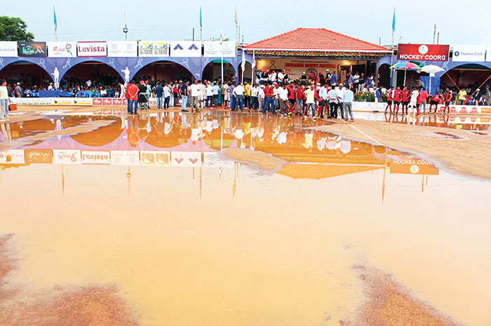 Moments later, the rain returned with greater intensity, turning the ground into a virtual stream. With further play impossible, officials from the Kodava Hockey Academy, referees and team managers declared Mandepanda the winners.