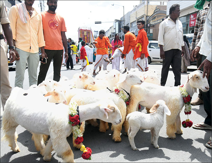 Agriculture Minister N. Cheluvarayaswamy riding a bullock cart along with Srirangapatna MLA Ramesh Babu Bandisiddegowda and K.R. Nagar MLA D. Ravishankar at a procession organised as part of Raitha Dasara in the city this morning.