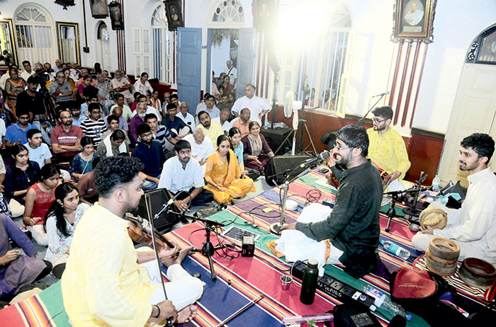 Picture below shows Vid. Abhishek Raghuram presenting a vocal concert, accompanied by Vid. Gokul Alankode on violin, Vid. Kishore Ramesh on mridanga and Vid. Sumukh Karanth on khanjira, at the Seetharama Mandira on Apr. 2.