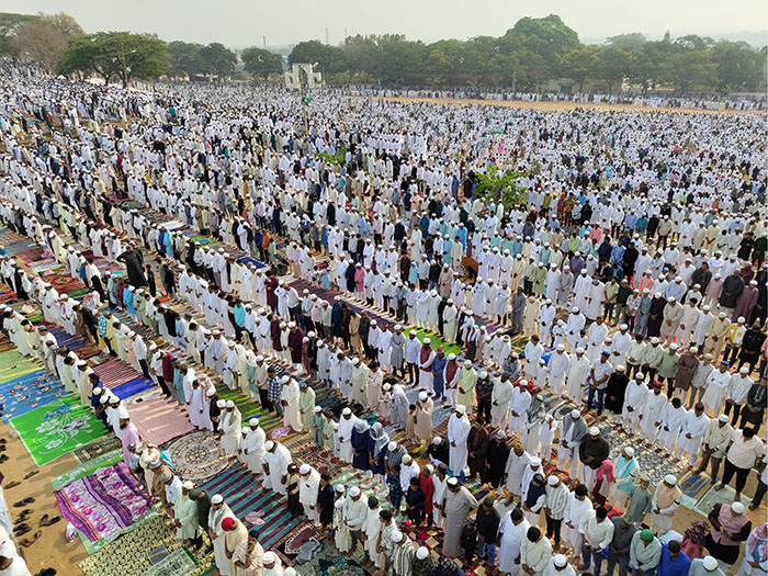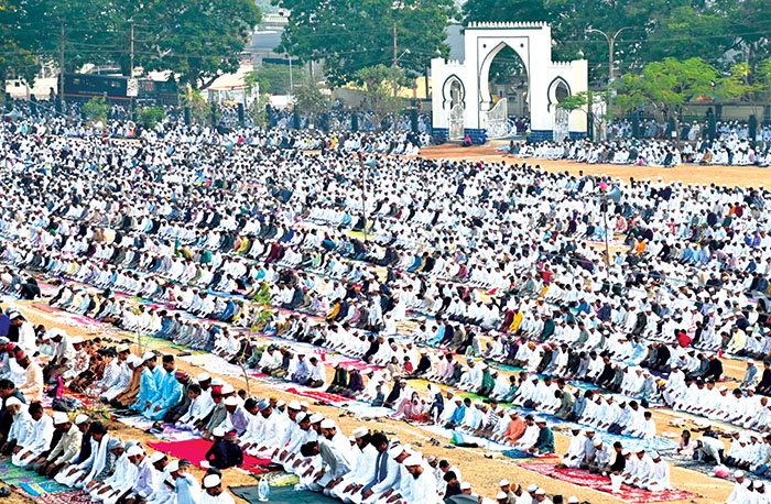 Mysuru: Thousands of Muslim brethren congregated at all Eidgah Grounds across the city and attended mass prayers to celebrate Eid-ul-Fitar (Ramzan) this morning. At the Eidgah Ground in Tilaknagar, Sir Khazi of Mysuru Hazarath Moulana Mohammed Usman Shariff spoke about the significance of fasting for a month and said, Muslims distribute 2.50% of their income in the name of ‘Zakath.’ ‘Fithra,’ another type of charity, is mandatory to every Muslim even for a baby born a day earlier, so that even the poor could celebrate Eid.