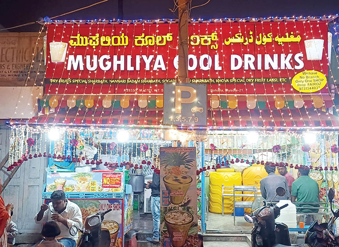 Mughliya Cool Drinks  at the junction of Savoy Chowk is drawing large crowds for its sherbets and faluda. Established in the year 1983 by late Syed Jaffer, the shop is now looked after by his son Fairoz Pasha. Khova Special Badam Lassi (Rs. 30 a glass), Nannari Badam Sherbet (Rs. 30), Khova Special Badam Sherbet (Rs. 40) and Dry Fruit Special Sherbet (Rs. 60 a glass).
