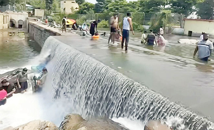 This morning, around 150 to 200 tourists, including women and children, were seen at Balamuri, venturing into the waterfall formed by a concrete barrier across the river.