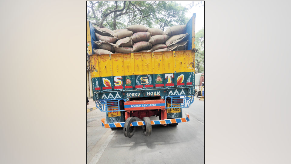 He was going towards Sayyaji Rao Road from Ummar Khayam Road when the lorry transporting Anna Bhagya food grains, proceeding towards K.R. Hospital, hit the motorcycle killing the youth on the spot. As a result, vehicular movement at the junction was disrupted for some time.