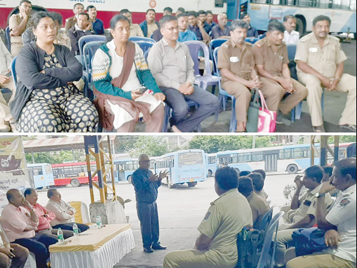 About 400 drivers from Kuvempunagar and Sathagalli Bus Depots were educated about accident zones, accident prevention, consequences on rash and negligent driving, traffic rules and Motor Vehicle Act by resource persons.