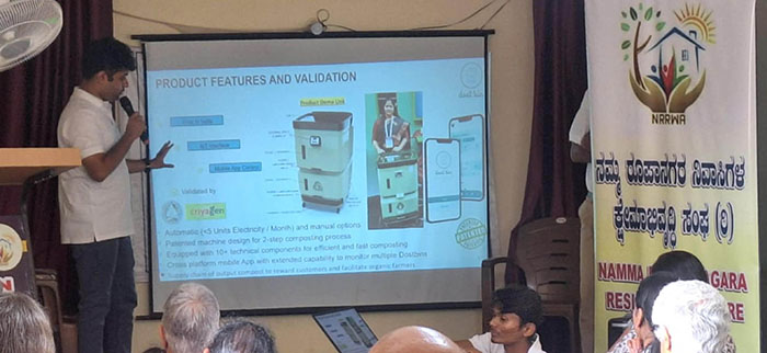 Nearly 80 residents from Roopanagar and neighbouring layouts participated. The core team from Dostbin Solutions, led by Shumail Ali Khan, demonstrated their innovative and award-winning composting bin and explained the composting process through a detailed presentation. Participants also gained hands-on experience in using the bins.