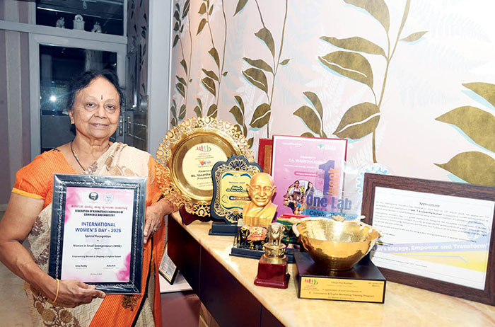 Apart from her artistic pursuits, Vasantha Kumari currently serves as President of WISE (Women In Small Enterprises), the women’s wing of the Mysore Chamber of Commerce and Industry (MCCI), where she encourages women to explore entrepreneurship and creative careers. Supporting her in this endeavour is her daughter-in-law Surekha Tholasi, herself an accomplished artist in Thanjavur and Mysore painting styles as well as charcoal art.