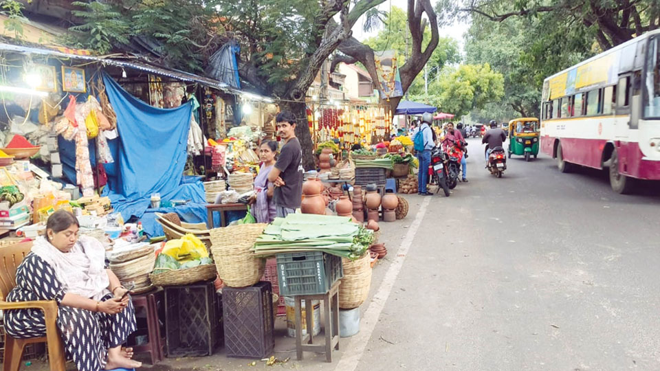 Mysore/Mysuru: Mysuru’s busiest stretches are increasingly turning unsafe as roadside vendor carts and makeshift stalls continue to occupy footpaths and even spill over onto roads, inconveniencing pedestrians, commuters and residents alike. The unchecked encroachment has worsened traffic movement and created hazardous conditions that have already claimed lives.