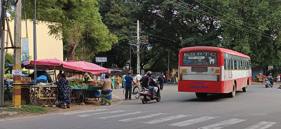 At Nanjumalige Circle (Kanaka Circle), for instance, sections of Madhvachar Road have virtually no walking space, as vendors occupy the entire footpath. M.A. Sreenivasan Circle and the JLB Road–Madhvachar Road intersection face similar problems, where roadside vending disrupts traffic flow and reduces visibility for motorists. Adding to the danger, KSRTC buses ply these same routes daily, heightening the risk of mishaps.