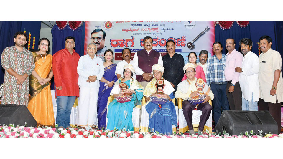 Sugama Sangeetha Singer Rashmi Chikkamagalur, Karnatak Classical Music Singer M.L. Bharati and Hotelier Mahesh Kamath were felicitated during the ‘Raaga Tarangini’ musical programme, organised jointly by the District Unit of Karnataka Sugama Sangeetha Parishat and Bluemind Solutions, at Sri Nadabrahma Sangeetha Sabha on JLB Road in city recently. They are seen with Kannada and Culture Department Joint Director V.N. Mallikarjunaswamy, Sugama Sangeetha Parishat District President Nagaraj V. Bairy, Senior Journalist Amshi Prasannakumar, social worker K. Raghuram Vajapayee and others.