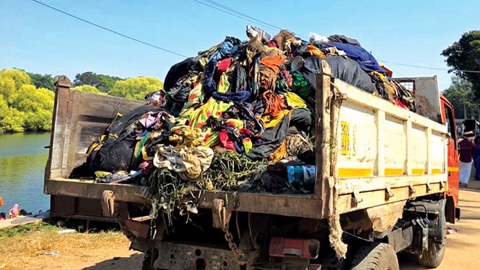 On Sunday, a large number of volunteers removed waste dumped in the River, including discarded clothes, earthen pots, malas, deity photographs, plastic covers and other puja materials.