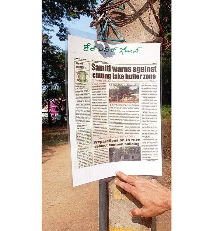 Mysore/Mysuru: In an attempt to draw attention to the shrinking buffer zones of lakes, a group of environmental activists early this morning put up posters around Kukkarahalli Lake, reproducing a recent report published in Star of Mysore. The laminated posters, hung on electric poles at a few locations inside the lake premises, caught the attention of morning walkers.