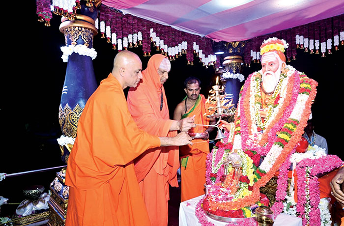 Suttur Seer Sri Shivarathri Deshikendra Swamiji and Adichunchanagiri Seer Dr. Sri Nirmalanandanatha Swamiji performing aarti to the idol of Adijagadguru Sri Shivarathreeshwara Shivayogi Mahaswamiji placed atop a float (Teppa) as part of ‘Teppotsava’ at River Kapila last night.