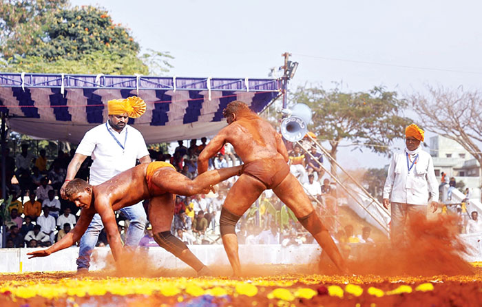 Wrestlers fight it out at the Wrestling Competition organised at Suttur in Nanjangud taluk yesterday.