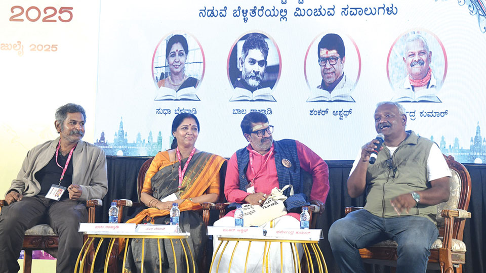 July 7, 2025Mysore/Mysuru: Maintaining both physical and mental health is essential for those aspiring to build a career in cinema, said actors Bala Rajwadi, Sudha Belawadi and Shankar Ashwath during the last Kannada panel discussion at the 9th Mysuru Literature Festival held at Gardenia, by the pool, Hotel Southern Star, last evening. Session titled ‘Cinemarangada Kashta-Nastagala Karmodagala…