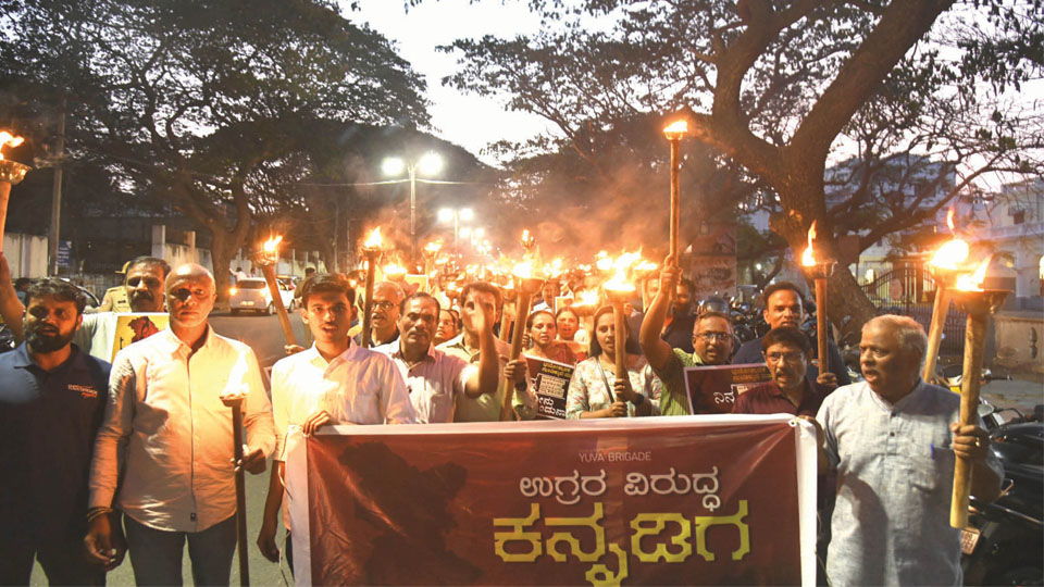 April 26, 2025Mysuru: Condemning the gunning down of innocent tourists by terrorists at Pahalgam in Jammu and Kashmir on Tuesday, Yuva Brigade and Mysuru Traders Suraksha Welfare Association took out a torchlight march in city on Thursday evening. Yuva Brigade: The members of Yuva Brigade, who reached Nanjaraja Bahadur Choultry on Vinoba Road, condemned the terror attack…