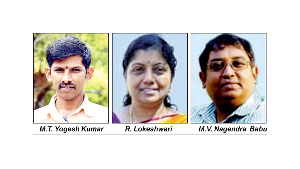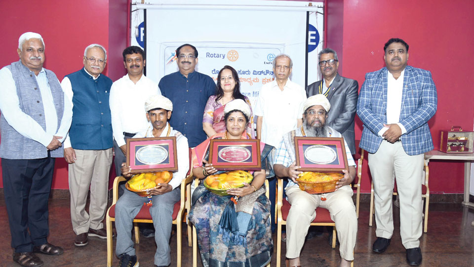April 24, 2025Sitting from left: Star of Mysore and Mysuru Mithra Senior Reporter M.T. Yogesh Kumar (MTY), Akashvani Announcer of Krushiranga-fame R. Lokeshwari and Cartoonist-cum-Fulbrighter M.V. Nagendra Babu (Banter Babu), who were conferred with Rotary Mysore Midtown Silicon Media Award at a function held at Rotary Centre on JLB Road in city last evening, are seen with…