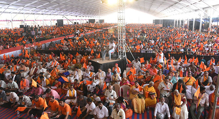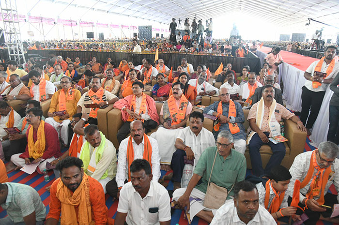 Earlier, Sri Ganapathy Sachchidananda Swamiji clad in ochre, walked into the venue, through the specially built ramp, even as the devotees waved saffron flags printed with slogans like – Jai Sri Ram and Om Namo Hanumathe Namaha.