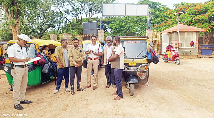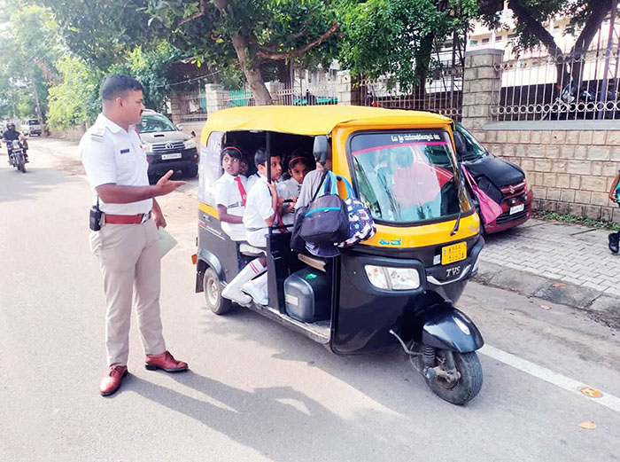 In a bid to ensure the safety of school children, the Traffic Police conducted checks on such vehicles across Mysuru this morning, while also creating awareness among drivers regarding traffic regulations.