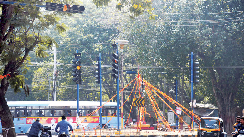 One such installation is in Bannimantap at Highway Circle (Maulana Abul Kalam Azad Circle), which features an iconic elephant sculpture fountain. Traffic Police have installed three blue traffic signal poles inside the Circle, spoiling the beauty of the Circle, a move that has drawn criticism from public.
