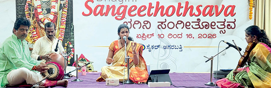 Vid. Abhiram Bode from Chennai presenting a vocal concert at BSS Vidyodaya premises in Krishnamurthypuram last evening as part of Bhagini Sangeethothsava. He is accompanied by Vid. Keshav Mohankumar on violin, Vid. A. Radhesh on mridanga and Vid. Halambi Bhargava on kanjira. Picture below shows Vidu. Anjana P. Rao from Bengaluru presenting a vocal concert on Saturday, accompanied by Vidu. Pruthvi Bhaskar on violin, Vid. H.L. Shivashankar Swamy on mridanga and Vid. S. Manjunath on ghata.