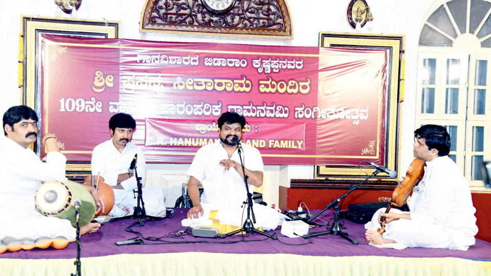 Vid. Kunnakudi Balamuralikrishna performing at Ganavisharadha Sri Bidaram Krishnappa’s Sri Prasanna Seetharama Mandira on Narayana Shastri Road in city on Apr. 12 as part of 109th Ramanavami Annual Heritage Music Festival. He is accompanied by Vid. Mysore Srikanth on violin, Vid. Tumkur B. Ravishankar on mridanga and Vid. Sharath Koushik on ghata.