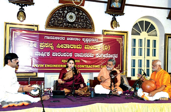 Mysore Brothers (Vid. Mysore Nagaraj and Dr. Mysore Manjunath) presenting a violin duet at Ganavisharadha Sri Bidaram Krishnappa’s Sri Prasanna Seetharama Mandira on Narayana Shastri Road in city on Apr. 14 as part of 109th Ramanavami Annual Heritage Music Festival. They are accompanied by Vid. Neyveli Venkatesh on mridanga and Vid. Giridhar Udupa on ghata. Picture below shows Vidu. Bhargavi Venkatram presenting a vocal recital accompanied by Vid. H.K. Venkatram on violin, Vid. Tumkur B. Ravishankar on mridanga and Vid. G.S. Ramanujam on ghata at the Mandira on Apr. 15.
