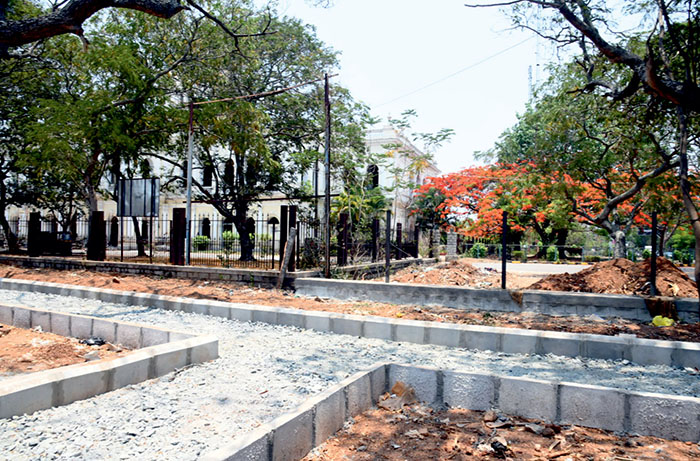 Works on paved walkways and landscaping underway at the War Memorial Park near old DC’s Office in Mysuru.