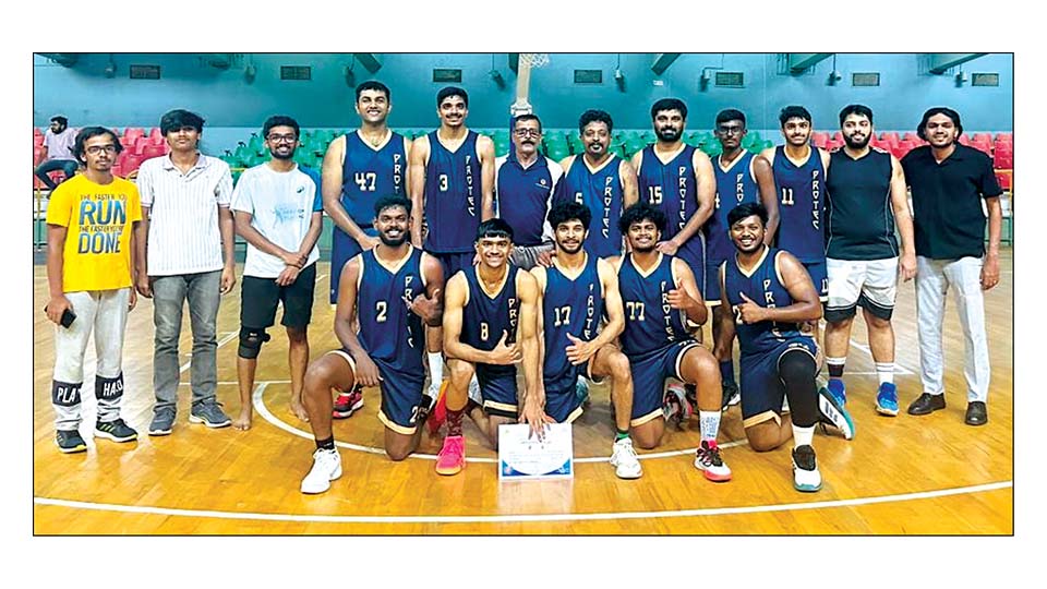 A group photo of men’s basketball team of The Protec Association, Mysuru, which won the District-level Dasara Basketball tournament held at Chamundi Vihar Stadium in city on Sept. 10. Seen are (standing from left) Srivatsa, Rohith, Rakshith, Samitinjai, Rohith Urs, Sethuram (coach), Divyanand, Gagan, Likith, Ranjith Urs, Pradhan and Rahul; (kneeling from left) Ranen Rajesh, Karthik, Vinayak Bhat, Ravindra and Keerthan. The team is qualified to play Divisional-level Dasara tournament at Dakshina Kannada on Sept. 13 and 14.